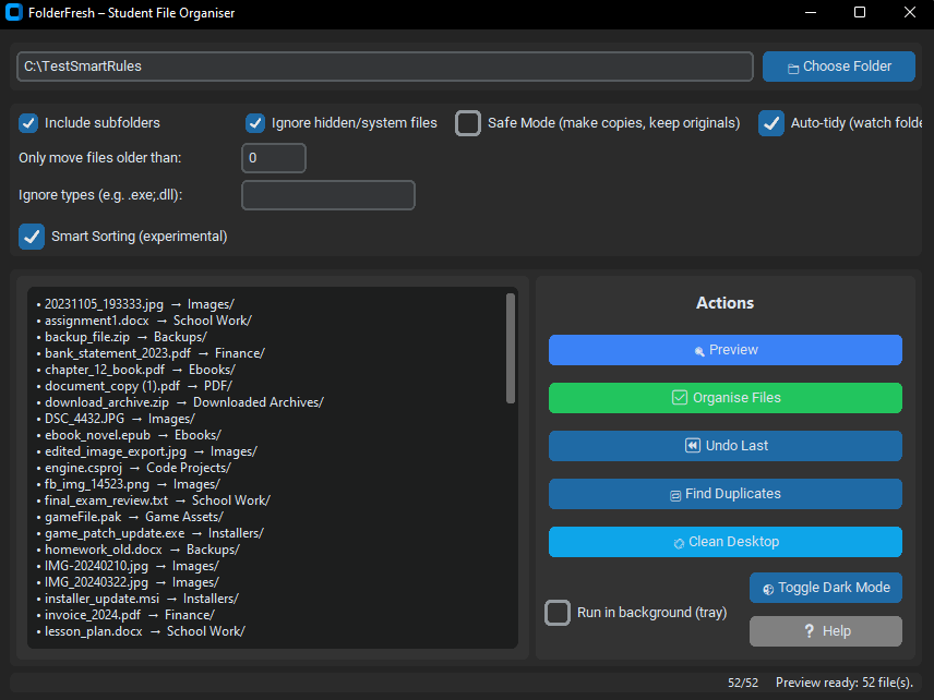 - Progress counter (x/y) during organise and undo.